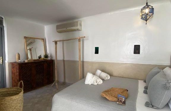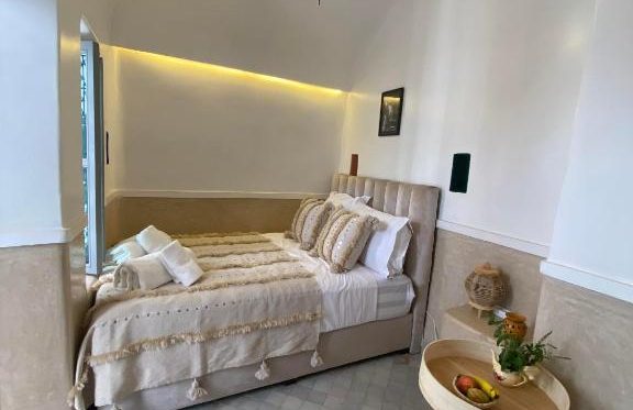 La chambre Jade (13 m²) évoque la pureté et l’élégance de la pierre précieuse dont elle porte le nom. Ses nuances douces créent une atmosphère apaisante, idéale pour un séjour intime au cœur du riad.